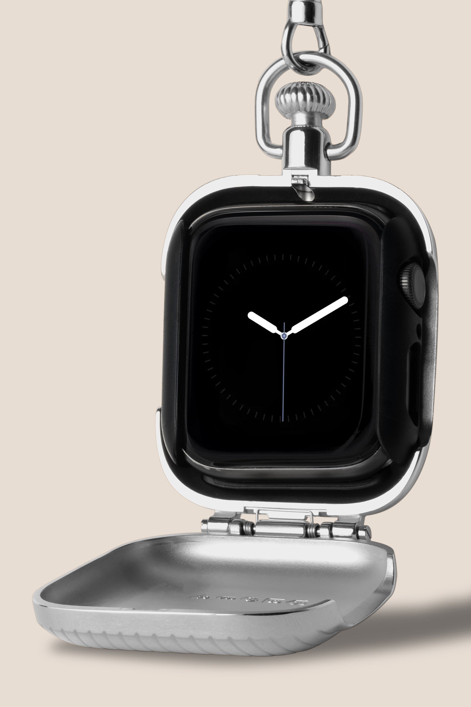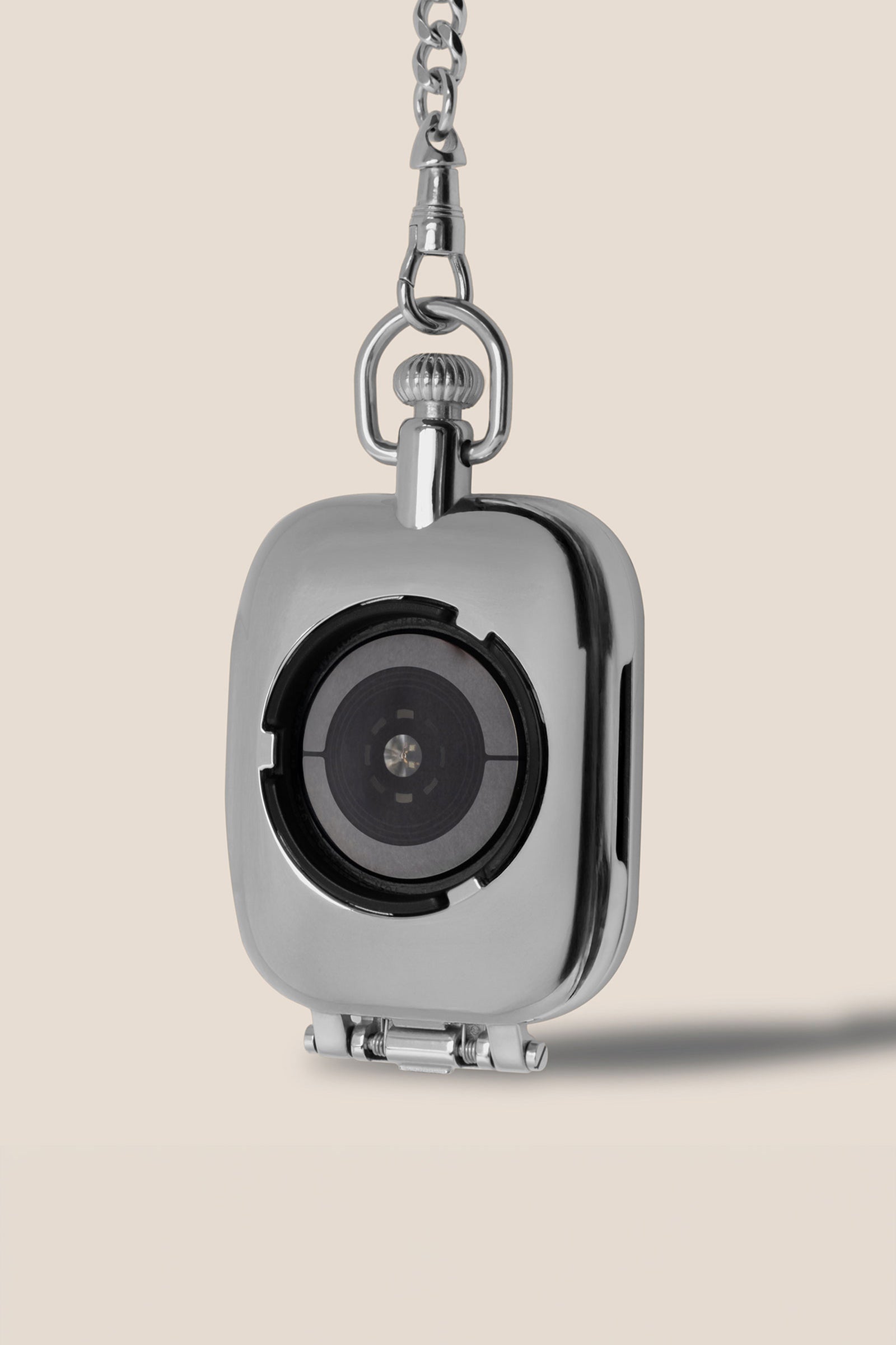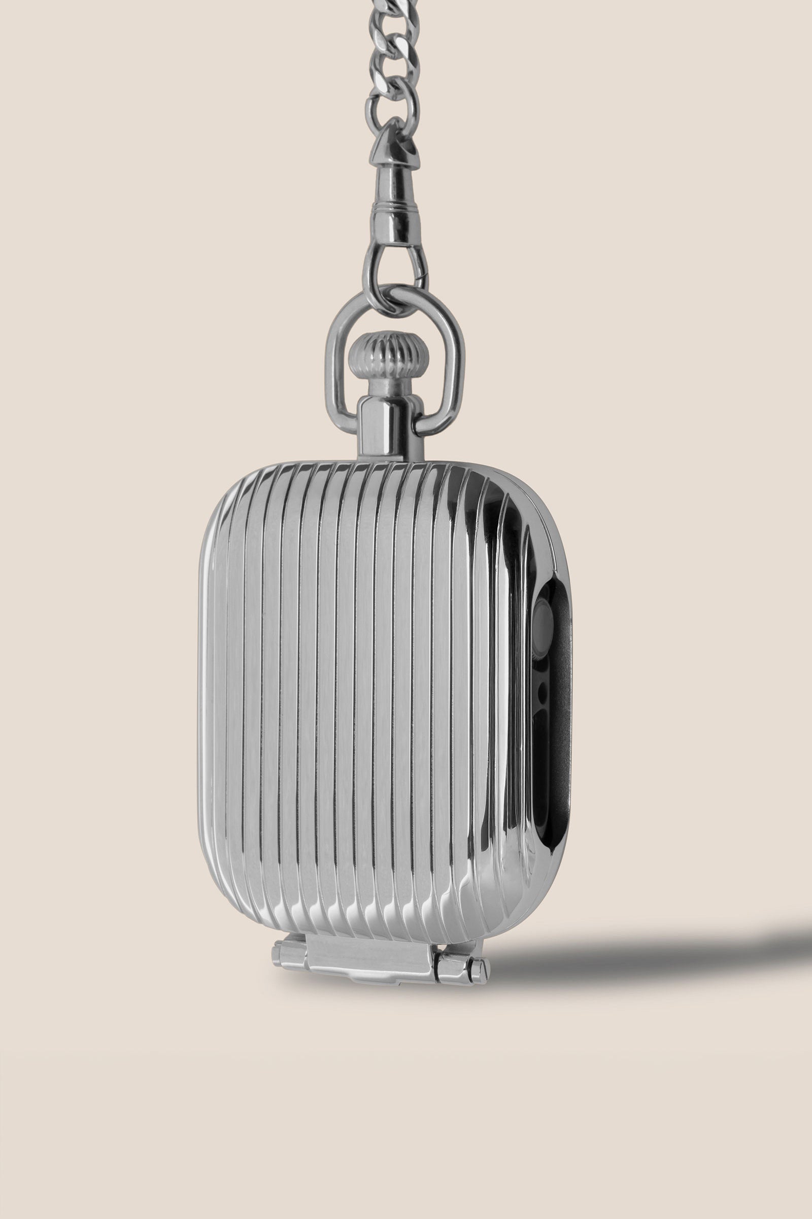 Our pocket watch accessory has recently been updated and now features an interior adapter system that secures your Apple Watch within the stainless steel casing.