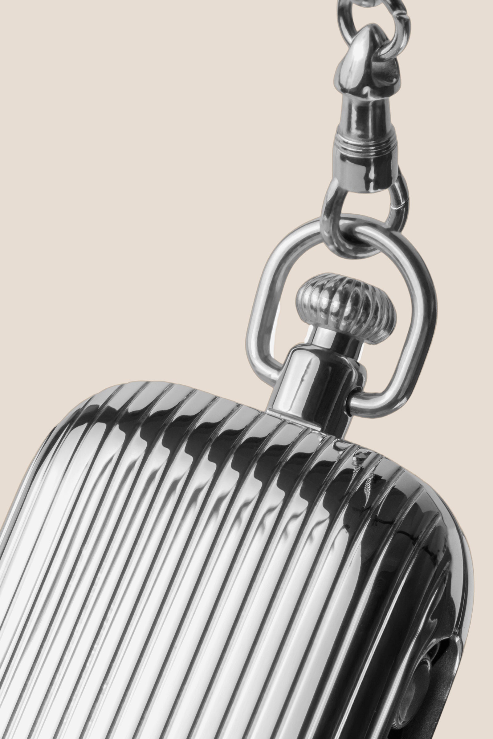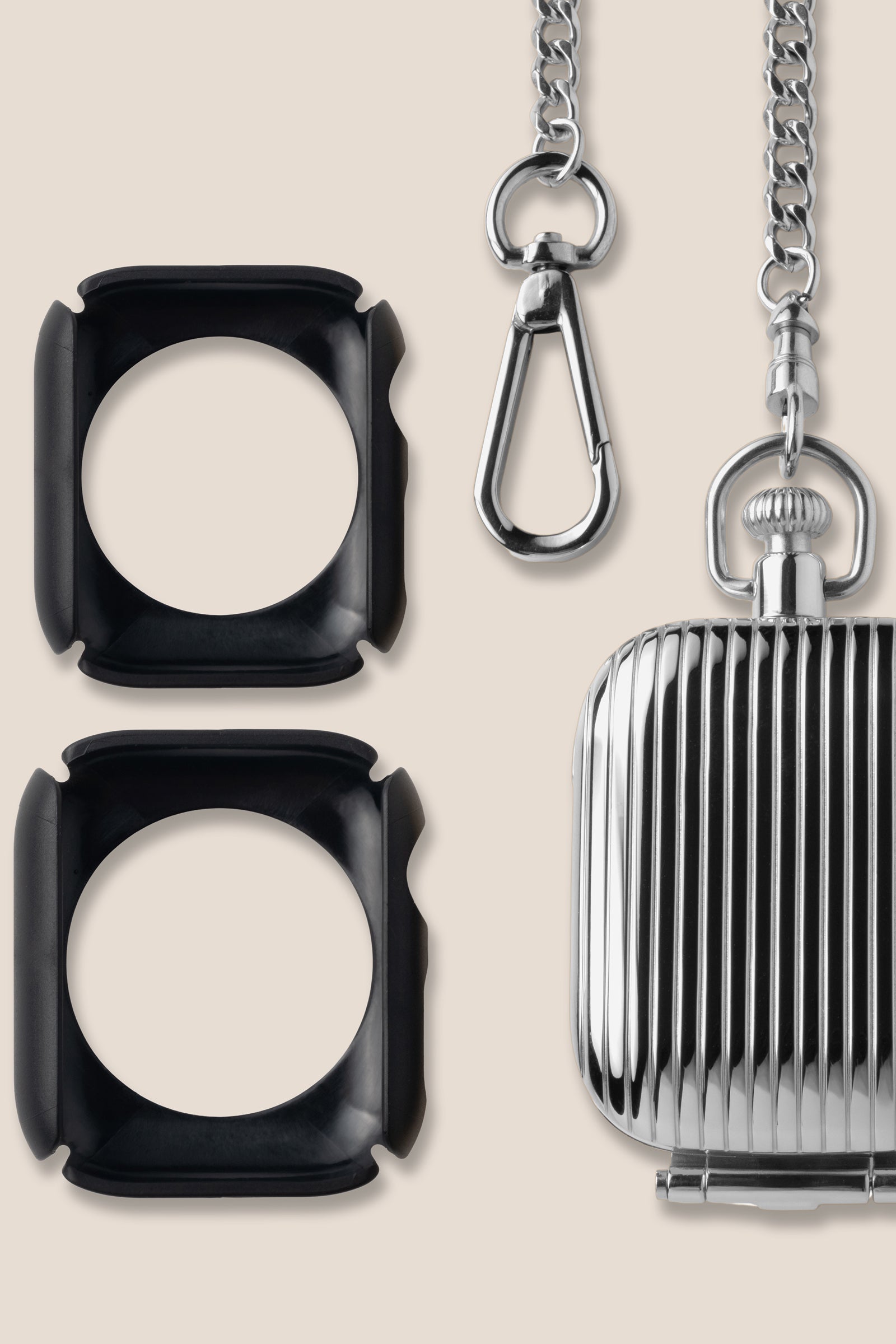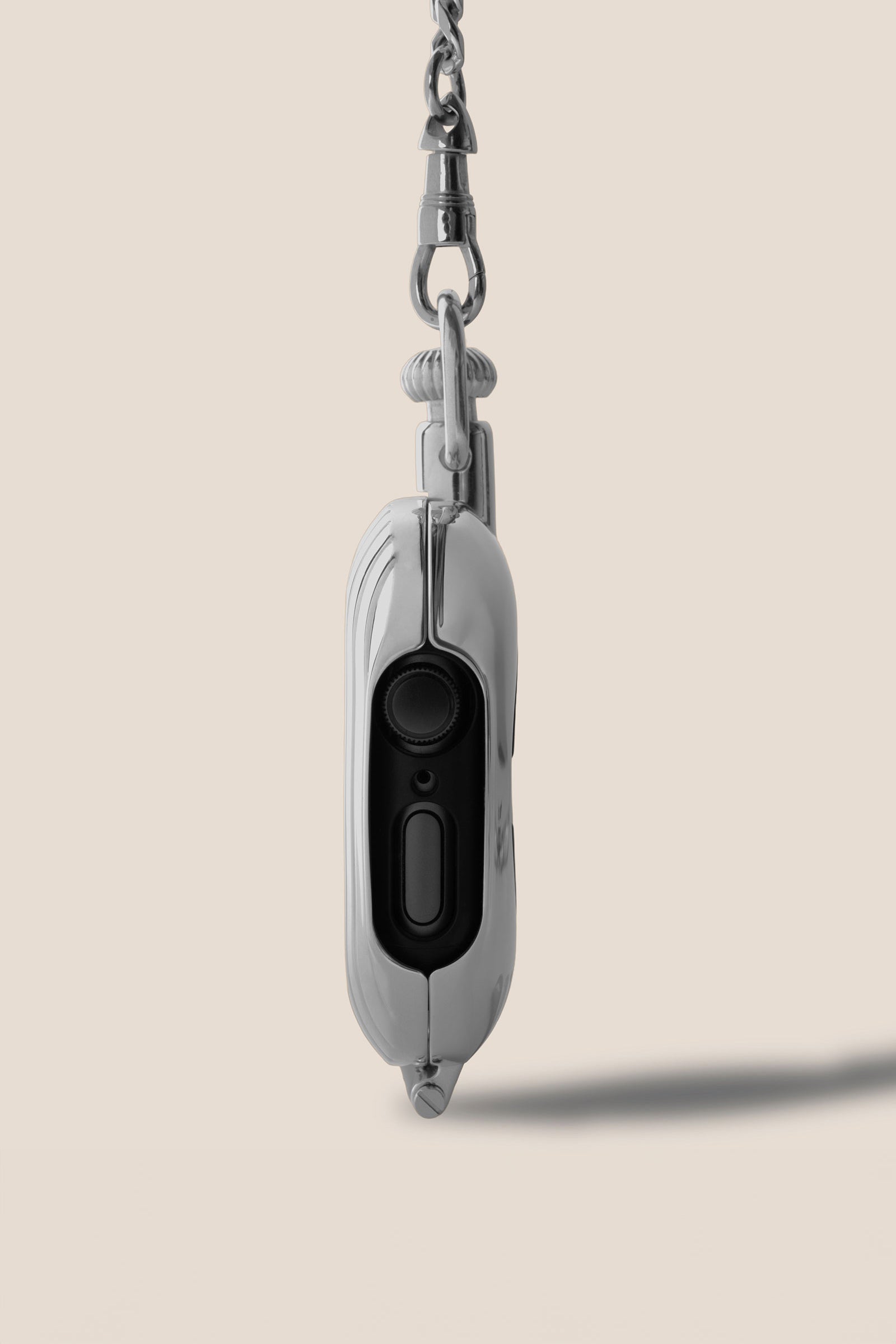 Our pocket watch accessory has recently been updated and now features an interior adapter system that secures your Apple Watch within the stainless steel casing.